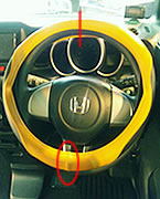 | 1.ハンドルカバー取り付け前の状態です。 ※シフトレバーを[P]に入れ、サイドブレーキを しっかり掛けてエンジンを止めてから取り付け を行って下さい。ハンドルを左右に切ってハンドルロックさせると作業しやすくなります。 | 2.ハンドルカバー取り付け前にセンター(赤線部)を決めます。 ※赤○部(縫製部)を真下に合わせます。 その後、センターより下方向に被せていきます。 | 3.このあたりからハンドルカバー空転を防ぐ為にきつくなってきます。 ○部分をめくる様に丁寧に被せていきます。 □部分は矢印の様に下方向に引っ張りながら装着していきます。 | 4.装着後、何度か左右にハンドルを切りハンドルカバーが空転しないかどうかを確認します。 ※万が一、カバーのみが空転する様でしたらご使用を控えて下さい。 |
